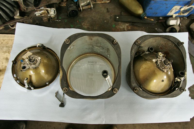Nachdem der Touring ja *immer noch nicht* fertig ist, hab ich mir die Scheinwerfer mal zur Brust genommen. Die lassen sich ziemlich einfach zerlegen, weil der Reflektor nur mit den beiden Einstellschrauben im Scheinwerferkörper gehalten wird. Eine Seite der Halter ist mit einer Schraube am Scheinwerferkörper befestigt, so muss man nicht beide Einstellschrauben verstellen/herausschrauben, sondern nur eine Seite, die andere geht komplett mit dem Halter raus.